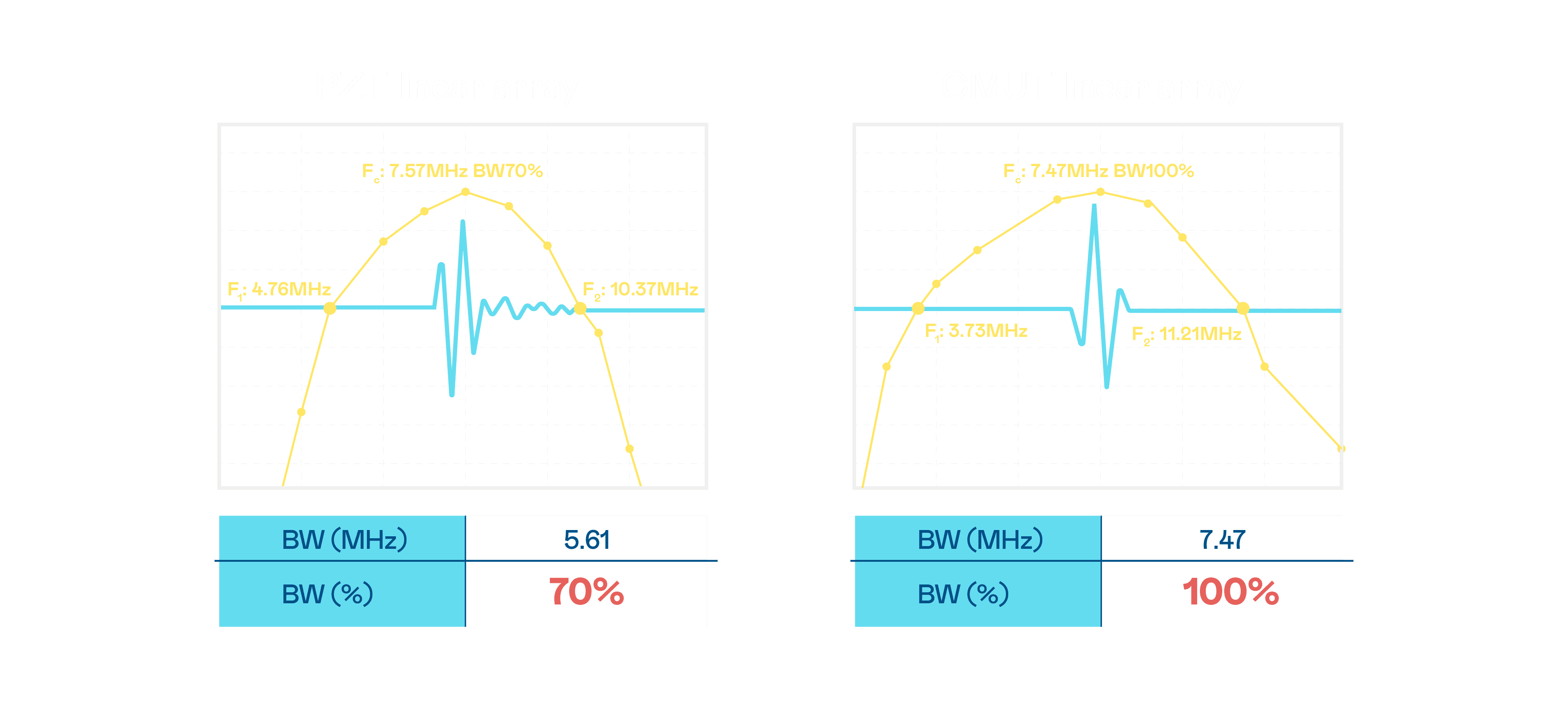 超音波影像的解析度高低,,,,首先取决于探头能发出的讯号频宽。。。。尊龙z6 CMUT 可提供高清晰的超音波讯号,,,,提供高频宽、、、、高灵敏度、、、、影像纹理细节更高的超音波影像,,,,协助医护人员缩短影像判读时间及利用精准的医疗影像进行诊断。。。