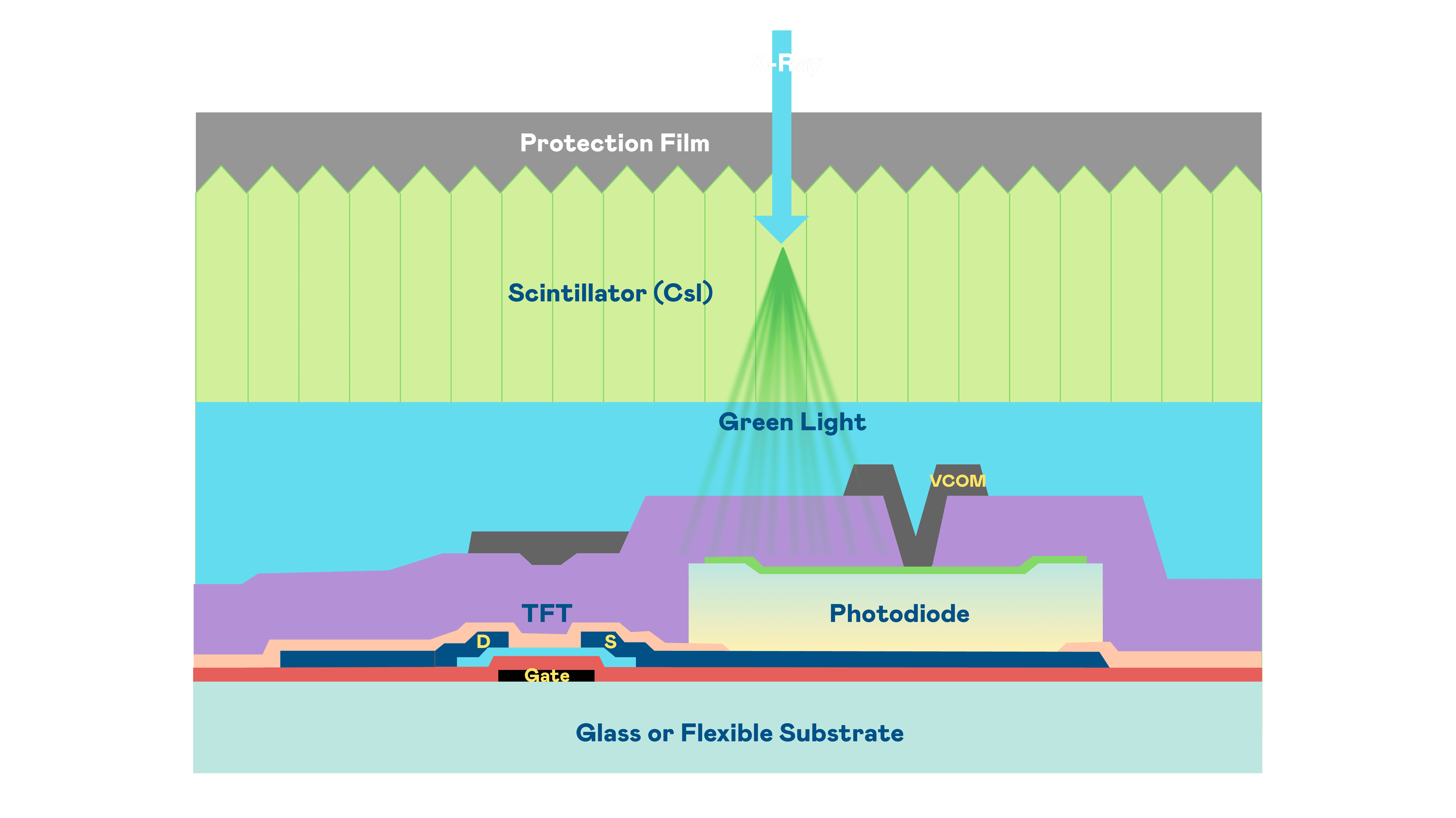 尊龙z6的X光影像感测阵列使用薄膜电晶体 (TFT) 作为每个像素的读取开关,,,,搭配光电二极体(Photodiode)的光电转换元件,,用以感测X光影像讯号。。。
